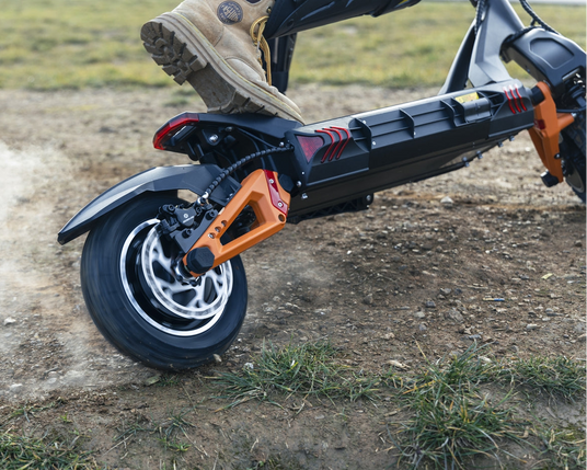 Rear platform is more than just a footrest — it’s a multi-functional control and support zone. Designed with a wide, textured surface for secure footing during high-speed rides or off-road terrain. The sturdy, foldable kickstand locks into place for stable parking — even on uneven ground. Reinforced with durable materials and accented with bold orange highlights, this section blends performance, safety, and style into one essential part of your ride.