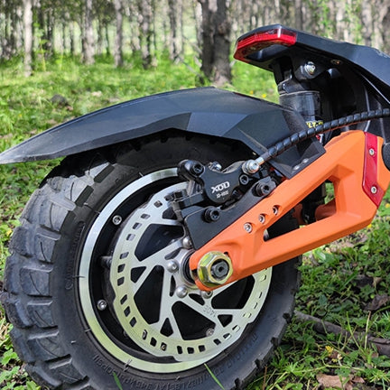 KuKirin G3 Pro is equipped with 140mm hydraulic disc brakes — large enough to deliver strong. It brings you to a full stop within just 5–10 meters, giving you confidence whether you’re riding on wet pavement, gravel trails, or city streets. The robust caliper and oversized rotor work together to dissipate heat efficiently, preventing fade during repeated braking — so you stay in control, no matter how hard you ride.
