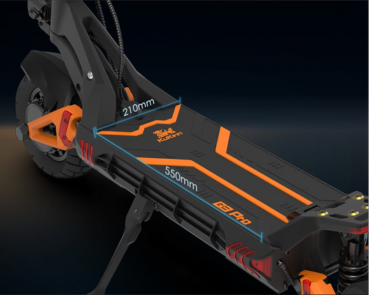 KuKirin G3 PRO features a massive 550mm x 210mm standing deck.Giving you plenty of room to shift your weight, ride confidently at high speeds, and carry loads up to 120kg. The textured, anti-slip surface ensures solid footing on wet pavement or rough trails, while the reinforced aluminum frame offers durability without adding bulk. With bold orange accents and precise dimensioning, this deck is built for performance, comfort, and style — no matter where your ride takes you.