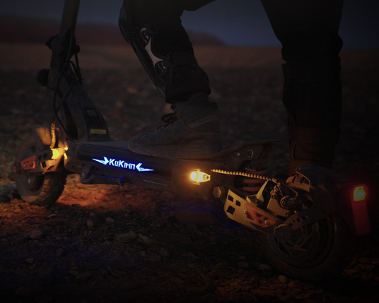 KuKirin G2 Master doesn’t just light your path — it commands attention. Its high-intensity LED front headlight cuts through darkness with a focused, wide beam, while the bright rear taillight ensures you’re seen from behind, even on unlit trails or city streets. Adding to its presence, the glowing blue “KuKirin” logo strip illuminates the deck, blending style with visibility. Whether you’re riding after sunset or exploring off-road at dusk, this lighting system delivers safety, confidence, and serious street presence.