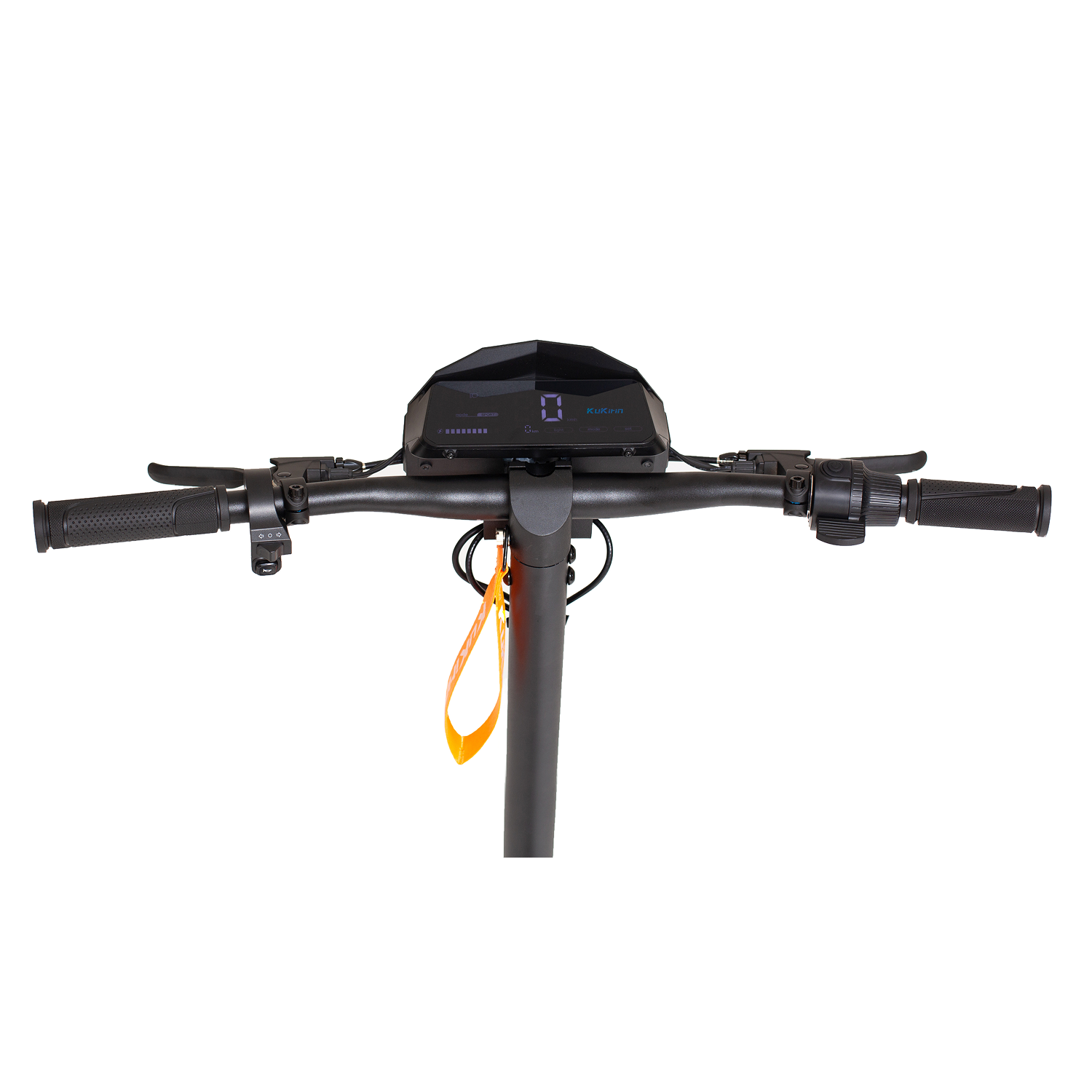 KuKirin G3’s extra-wide anti-slip deck & ergonomic handlebars ensure stable comfort for long rides. Its dual suspension absorbs road vibrations, delivering smooth control on urban streets or park trails for effortless gliding.